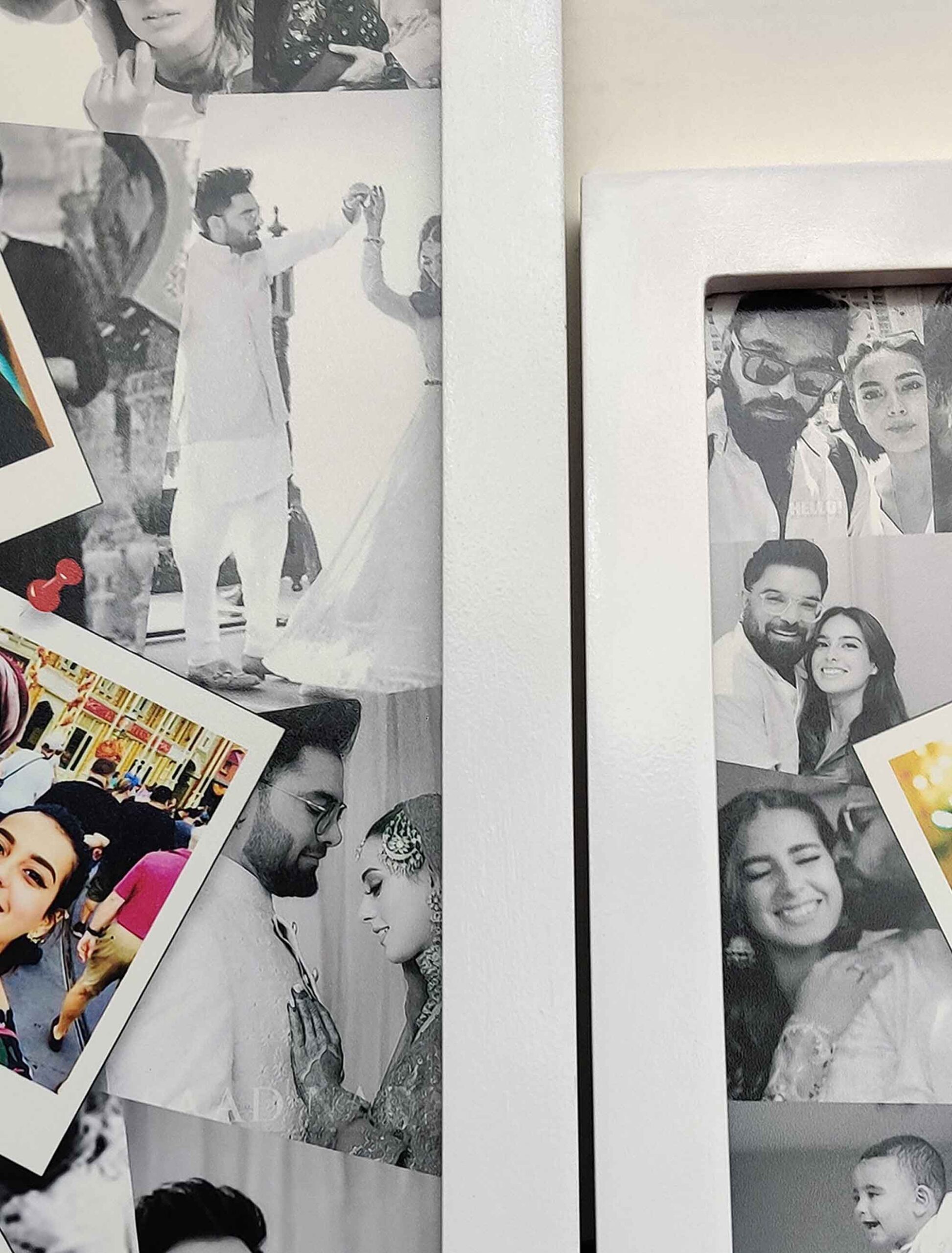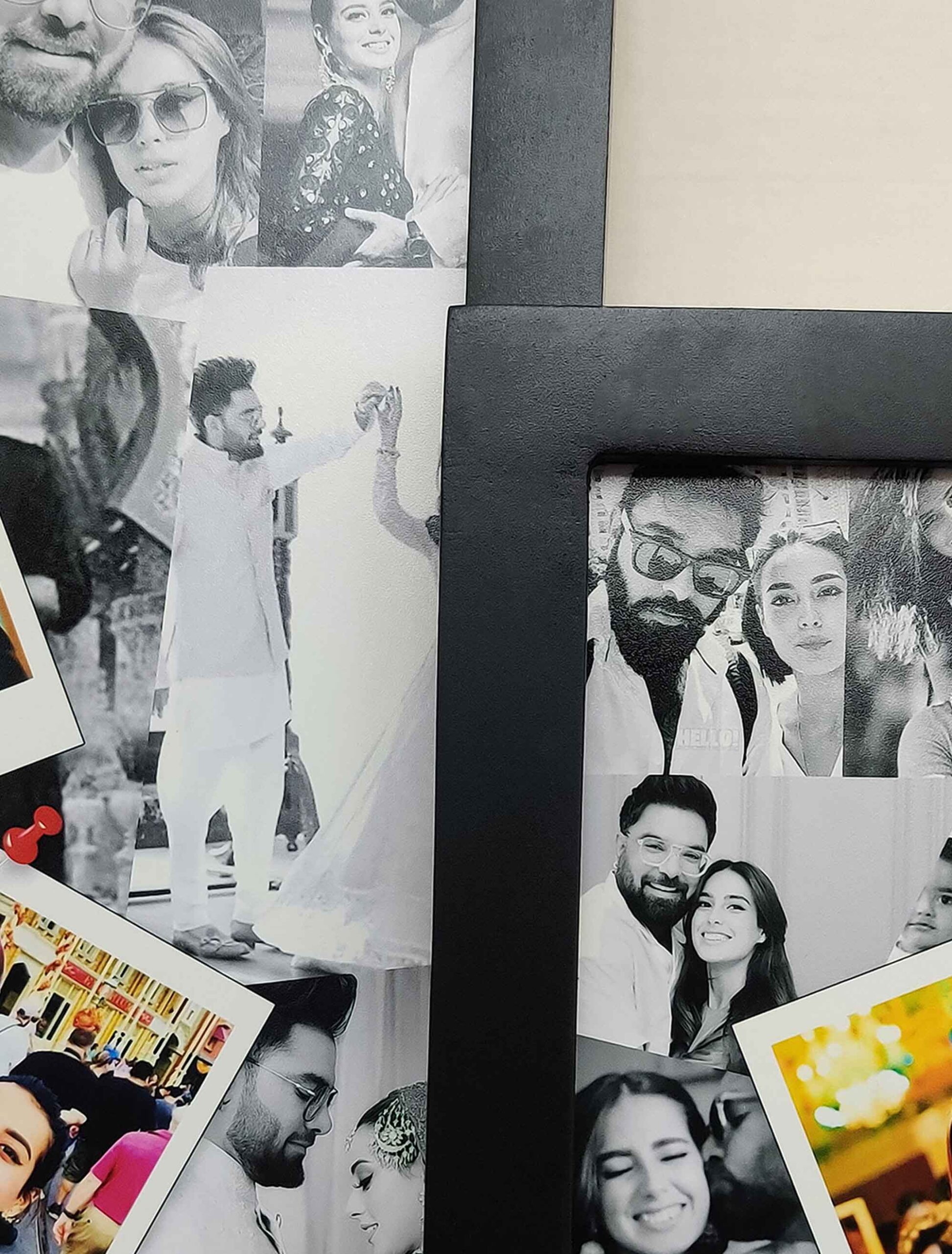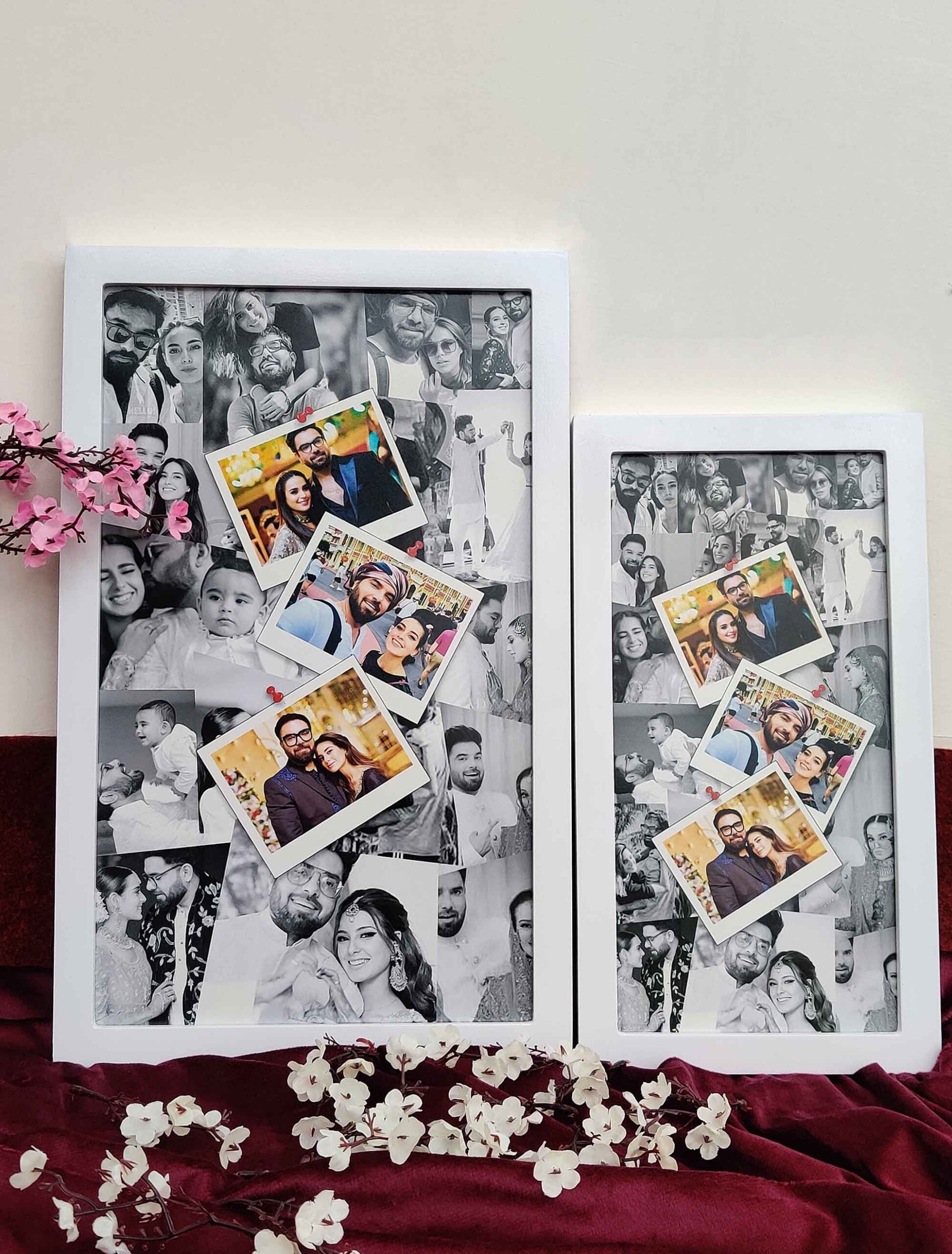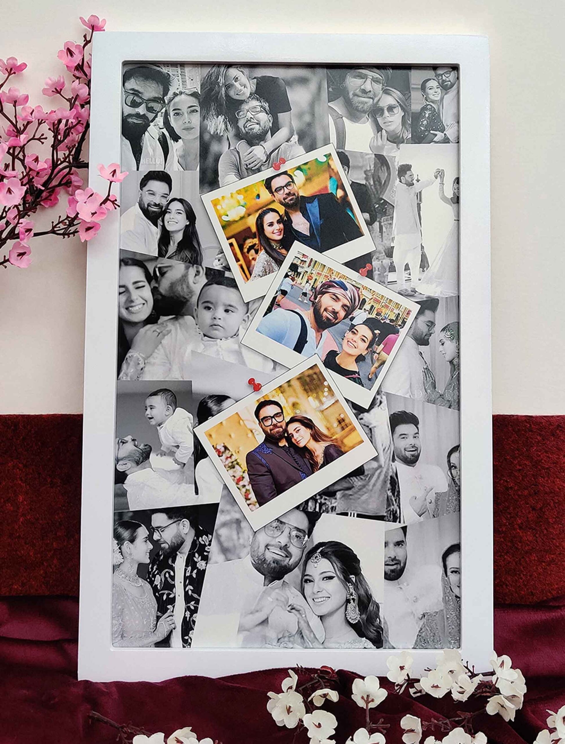 The design features a monochrome background, complemented by a collage of 13 images and 3 polaroid-style photos at the forefront. Available in 9?x15? and 6?x12?, we carefully craft each frame from durable materials such as Natural Wood. Moreover, as shown in the pictures, the frame features a matte finish in two color tones (black and white) that looks more satisfactory. Also, you can select the frame size, material, and color, based on your preferences.