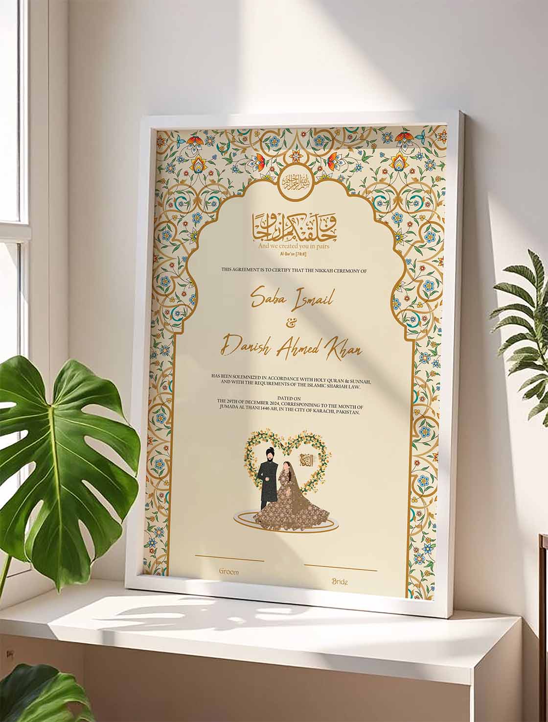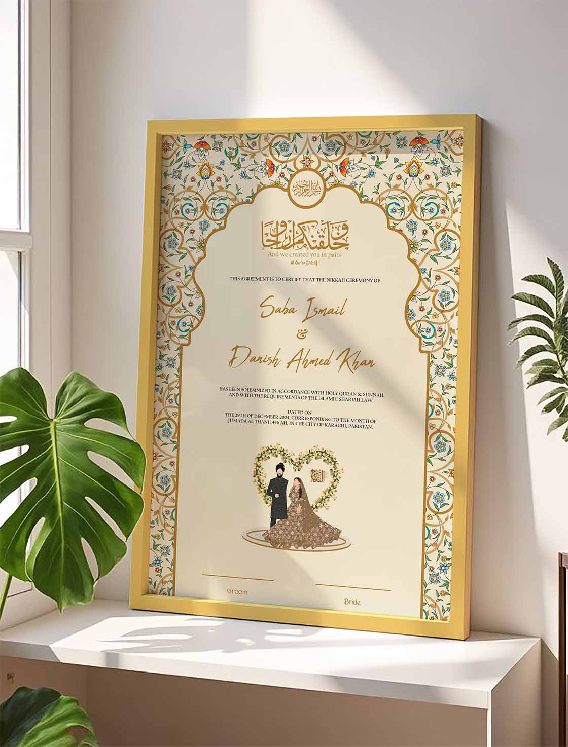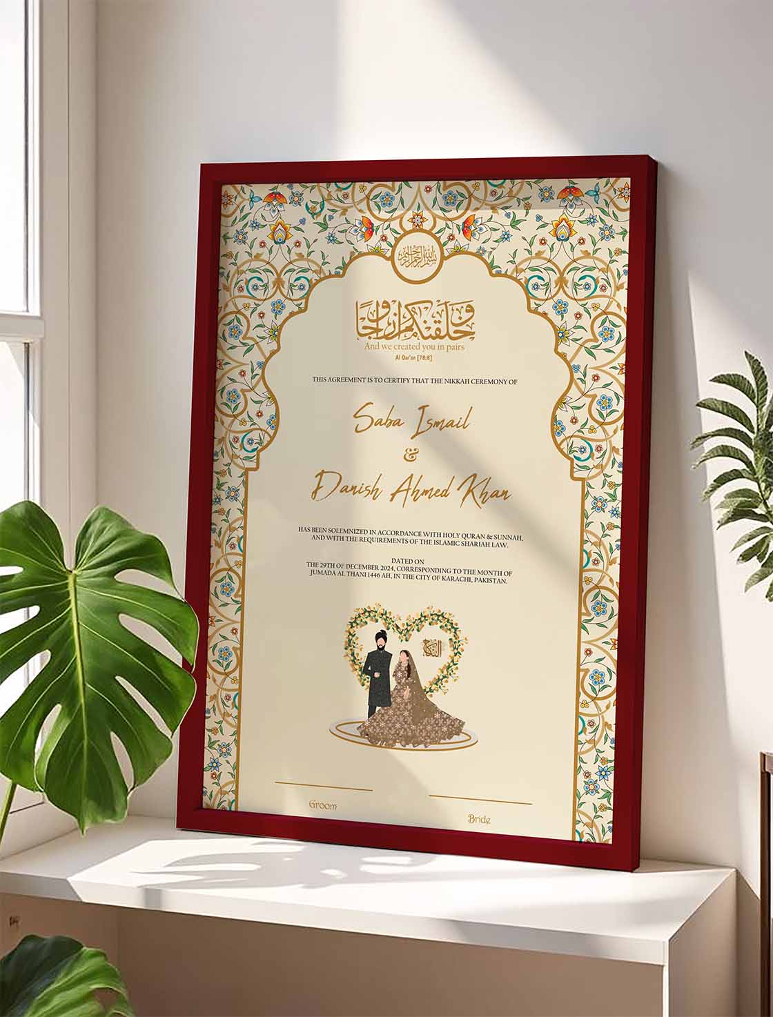 This custom nikkah certificate marriage contract is a trendy gift in Pakistan to give to the bride/groom either to preserve for yourself. You can personalize this nikkah frame according to your demands, such as by adding names and nikkah dates. The nikah contract frame features traditional floral patterns with beautiful printed calligraphy and a beautiful couple vector.