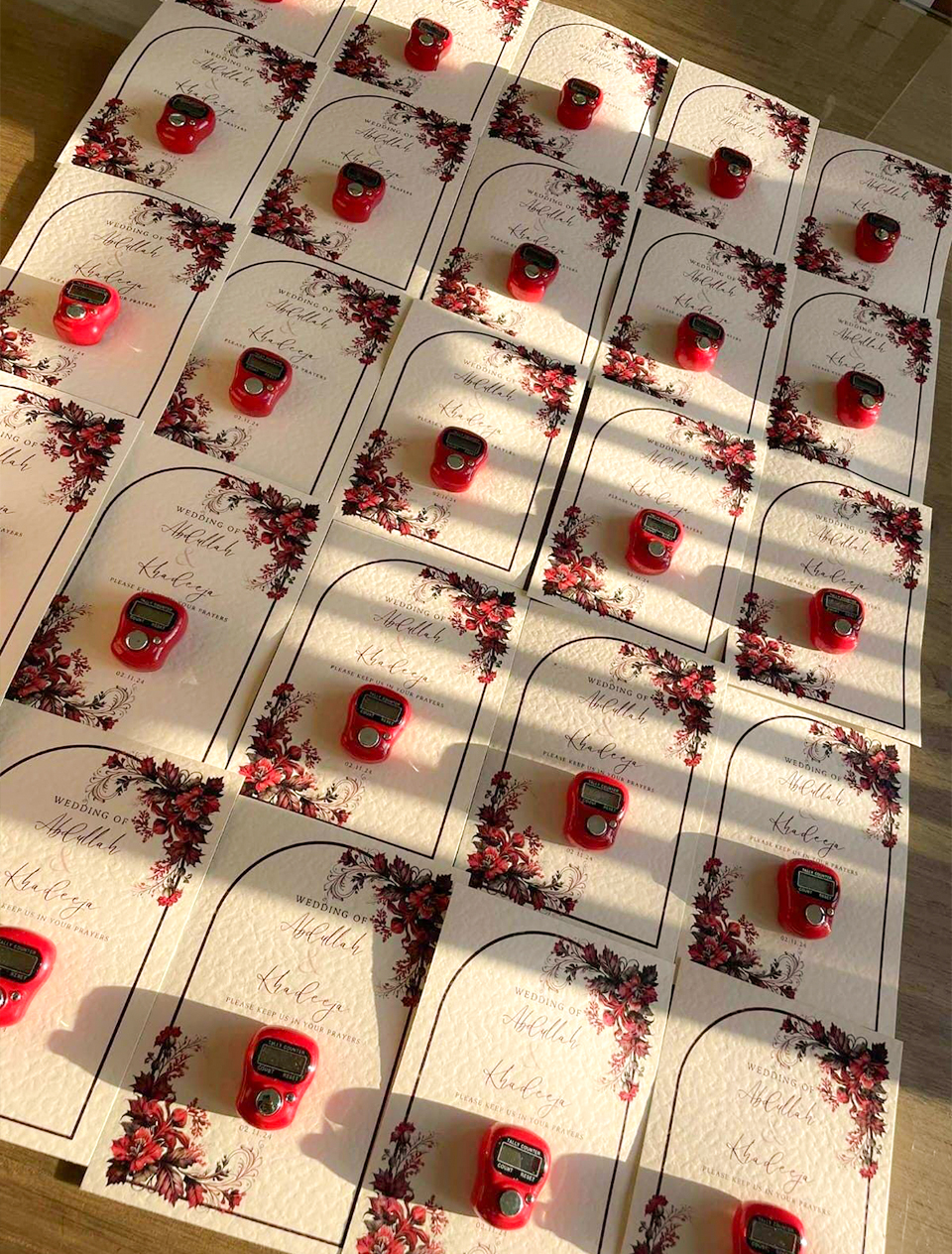• Favor Included: Each card comes with a high-quality, mini digital tasbeeh (counting device) securely attached.