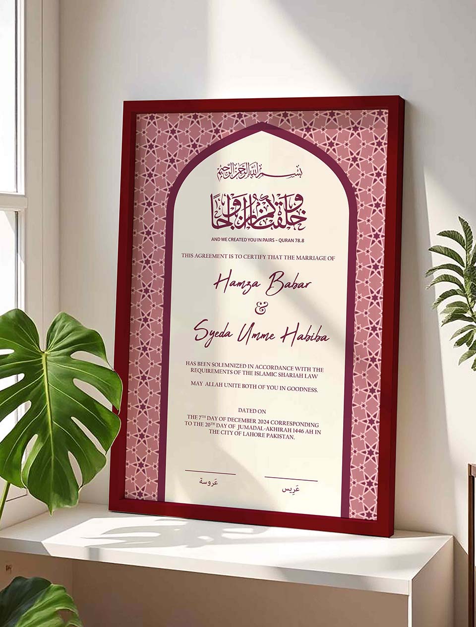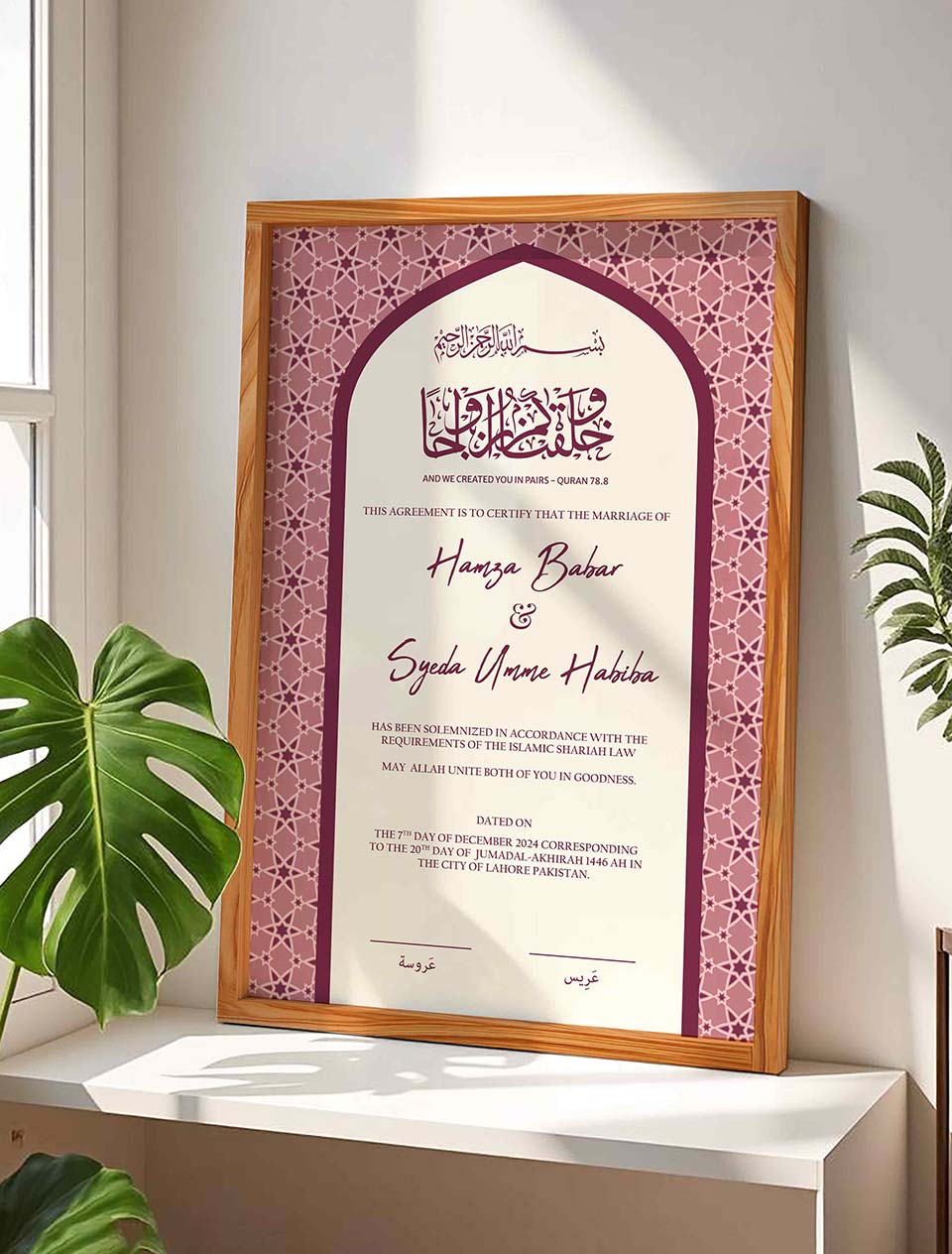 We package each frame securely to ensure it arrives safely at your doorstep, ready for you to display and admire. Whether you’re searching for a meaningful islamic wedding present or a special piece for yourself, our nikkah certificate frames beautifully preserve the memories that matter. Place your order now according to your requirements and enjoy fast delivery in Pakistan. We are confident that our product will surpass your expectations.