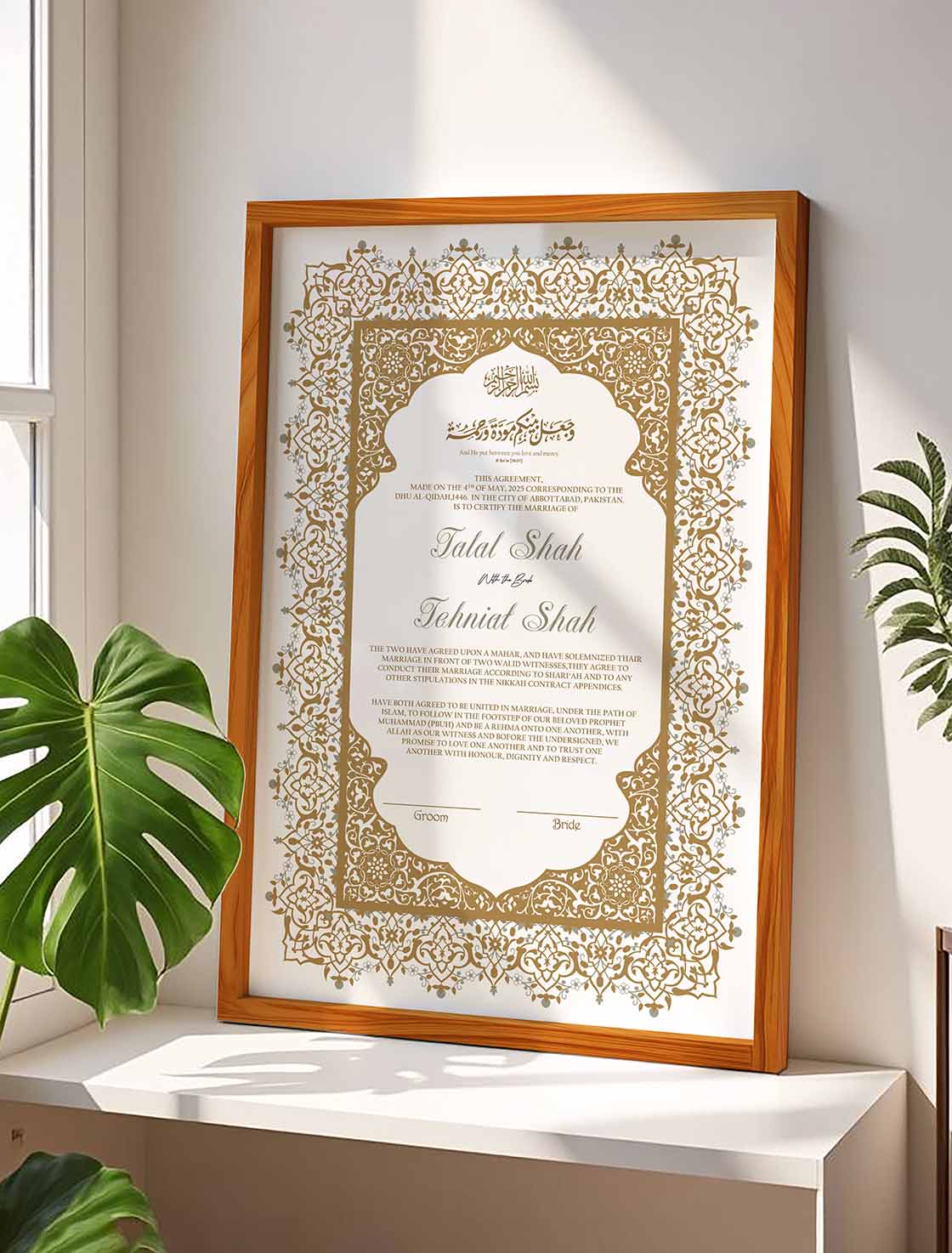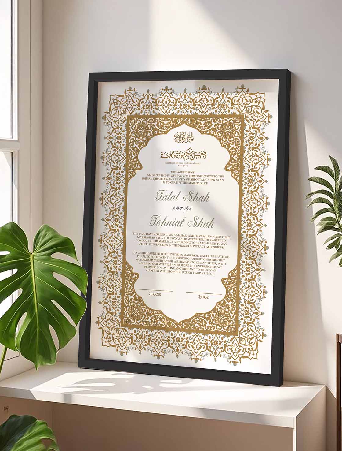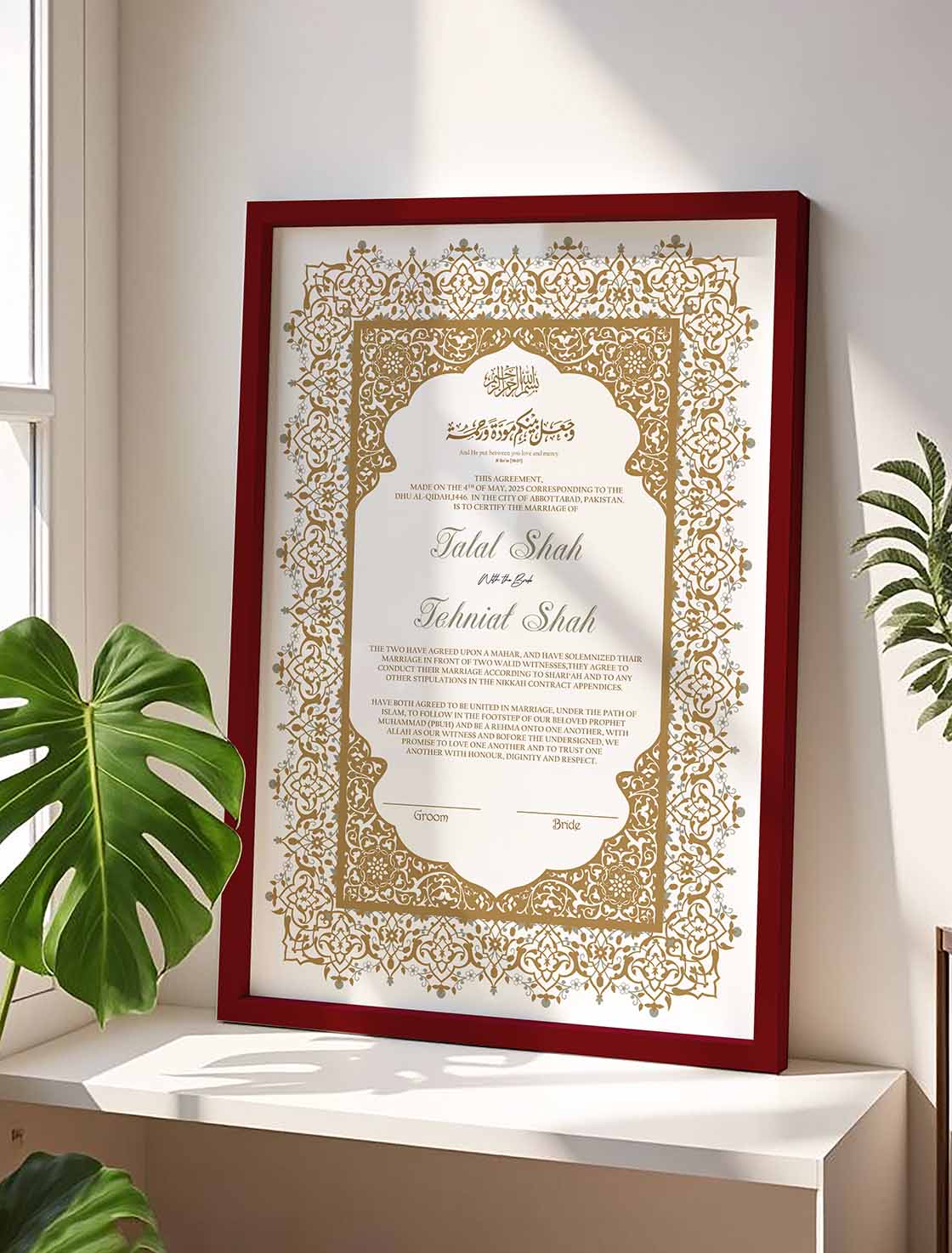 We package each frame securely to ensure it arrives safely at your doorstep, ready for you to display and admire. Whether you’re searching for a custom wedding contract or Luxury Nikah Certificate, our certificate frames beautifully preserve the memories that matter. Place your order now according to your requirements and enjoy fast delivery in Pakistan. We are confident that our product will surpass your expectations.