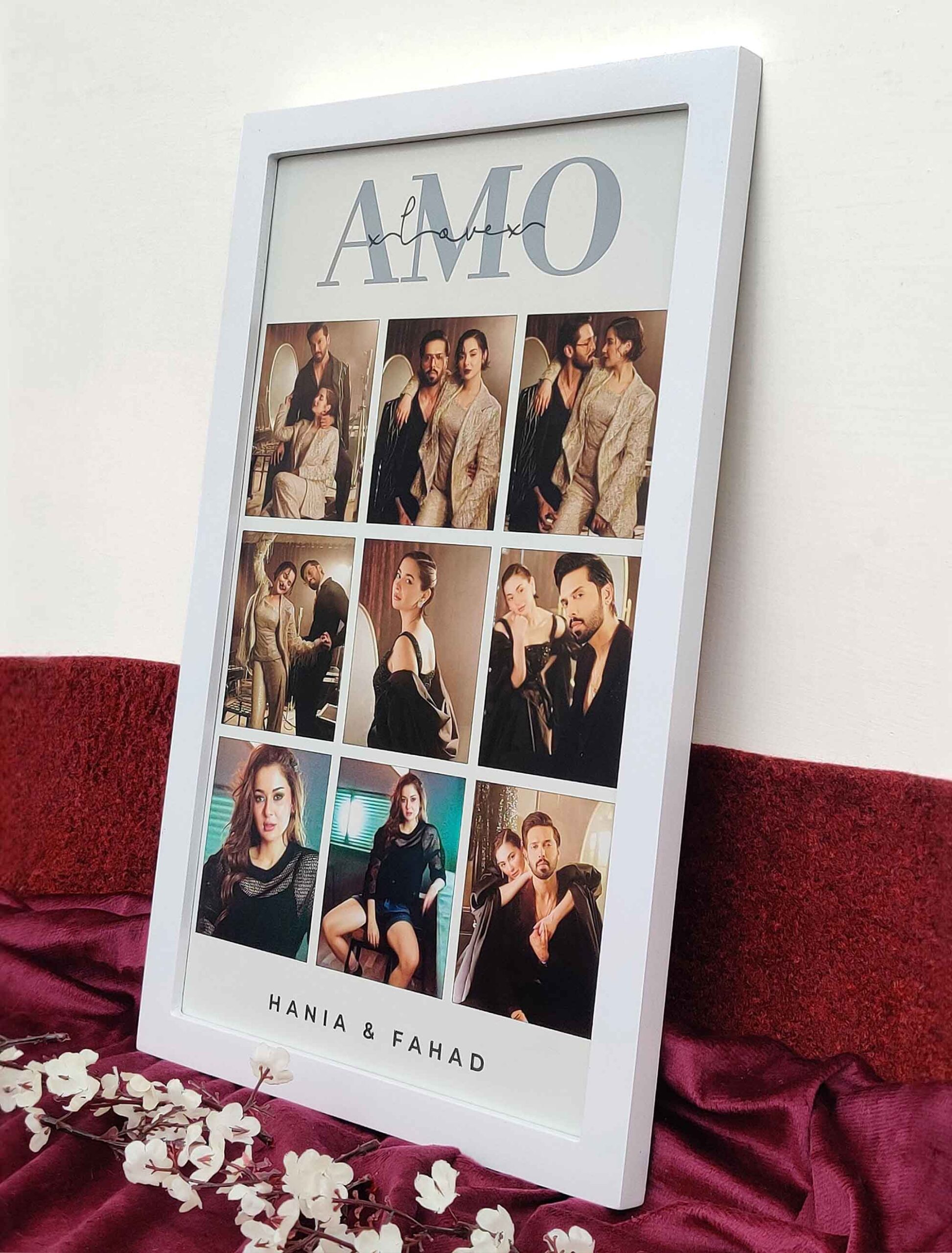 The design features a 9-image collage, complemented by the couple’s name at the bottom and ?I Love You? in Spanish at the top. Available in 9?x15? and 6?x12?, we carefully craft each frame from durable materials such as Natural Wood. Moreover, as shown in the pictures, the frame features a matte finish in two color tones (black and white) that looks more satisfactory. Also, you can select the frame size, material, and color, based on your preferences.