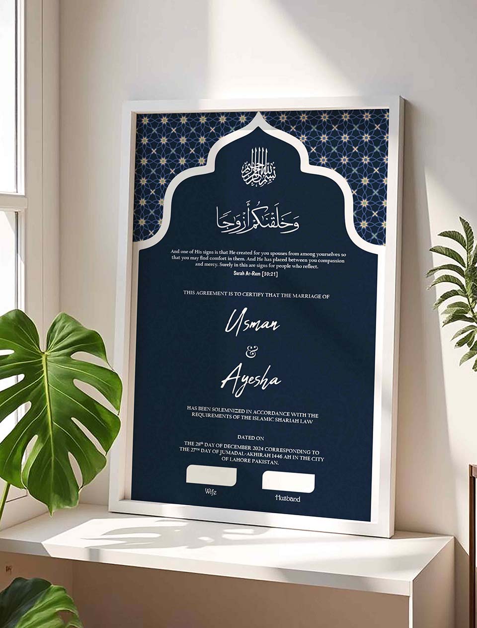 We package each frame securely to ensure it arrives safely at your doorstep, ready for you to display and admire. Whether you’re searching for a meaningful muslim wedding contract or a special piece for yourself, our nikkah certificate frames beautifully preserve the memories that matter. Place your order now according to your requirements and enjoy fast delivery in Pakistan. We are confident that our product will surpass your expectations.