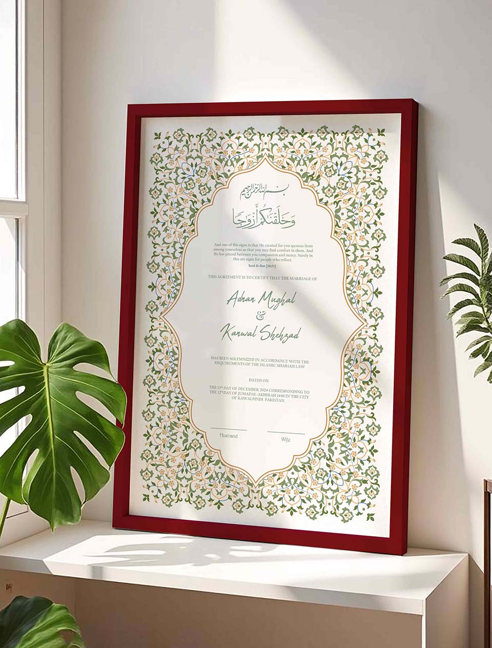 We package each frame securely to ensure it arrives safely at your doorstep, ready for you to display and admire. Whether you’re searching for a meaningful nikah contract or a special piece for yourself, our nikkah certificate frames beautifully preserve the memories that matter. Place your order now according to your requirements and enjoy fast delivery in Pakistan. We are confident that our product will surpass your expectations.