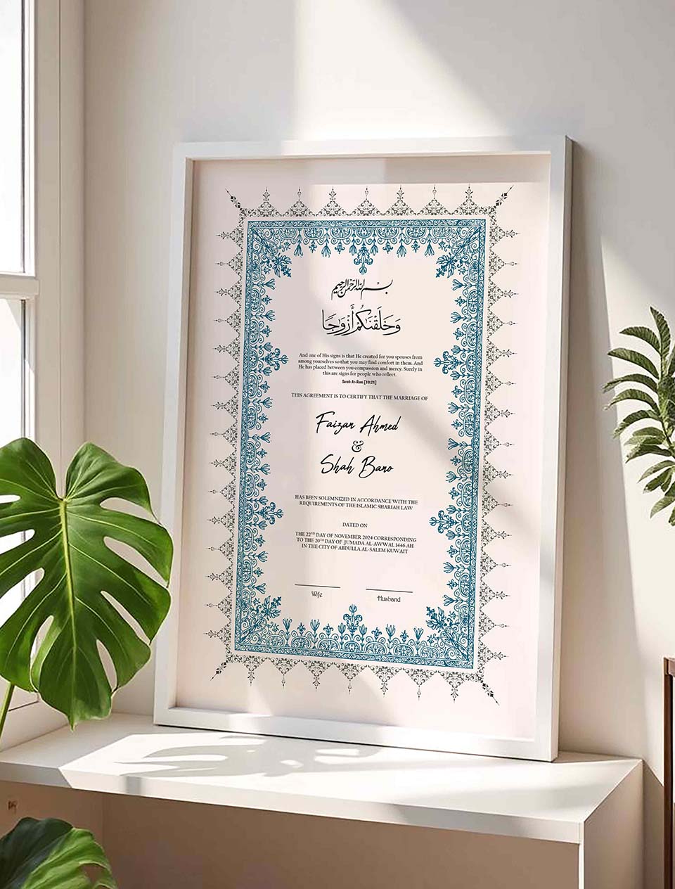 This modern nikahnama frame is a thoughtful wedding/anniversary gift for couples or you can have it for yourself. You can customize this nikkah certificate frame to match your preferences perfectly, such as by adding names and nikkah dates. The nikah nama frame features elegant blue geometric patterns inspired by modern Islamic art.