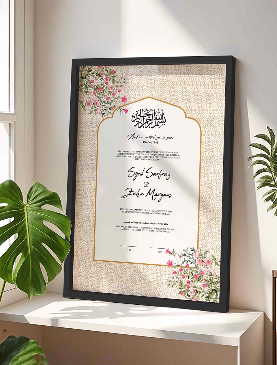 This Personalized Wedding Certificate Frame is a thoughtful nikkah gift for the bride/groom, showcasing a floral border and arch motifs. You can customize this nikkah nama to match your preferences perfectly, such as by adding names and nikkah dates.