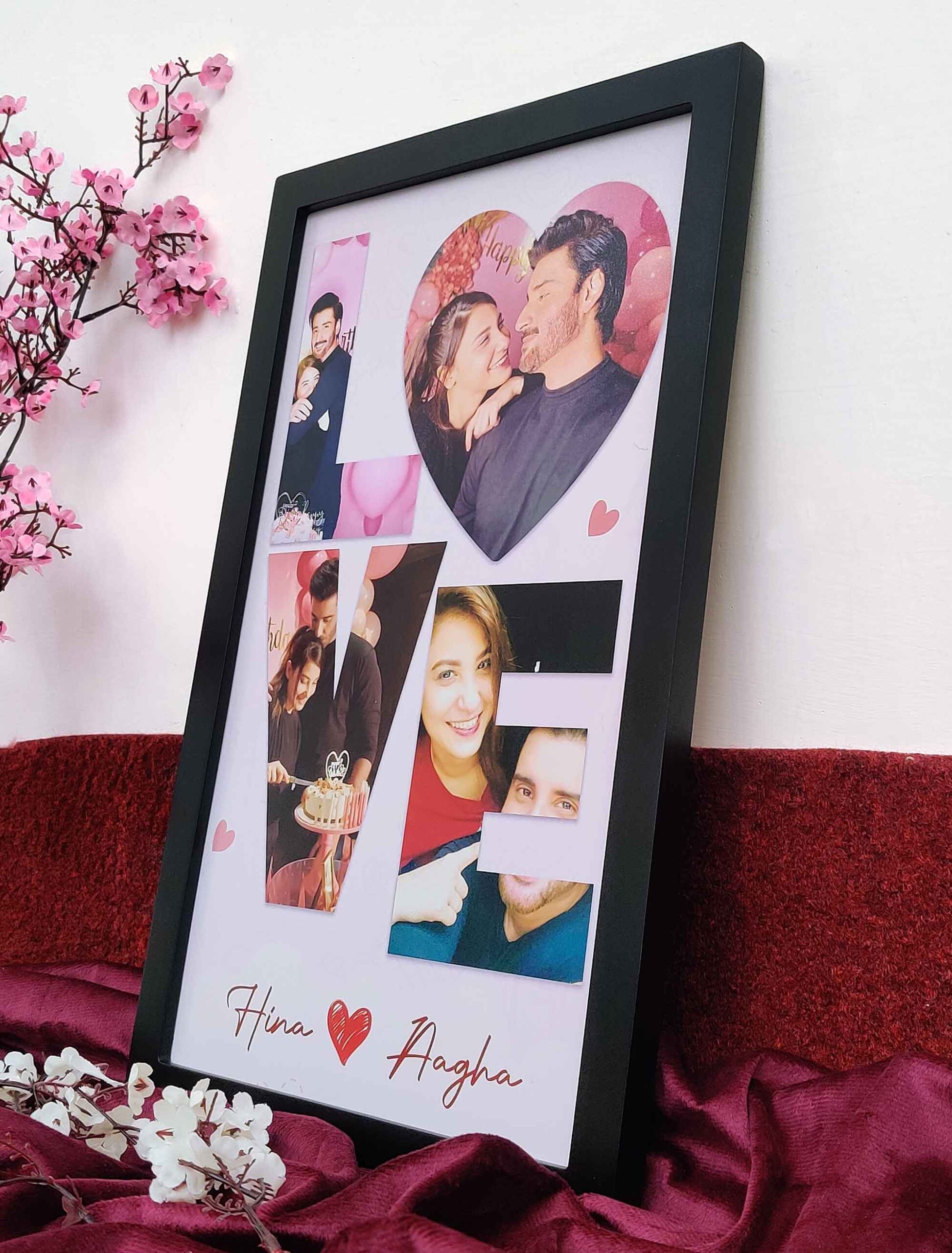 The design features 4 images within each letter of the word “LOVE,” and the couple’s name displayed at the bottom. Available in 9?x15? and 6?x12?, we carefully craft each frame from durable materials such as Natural Wood. Moreover, as shown in the pictures, the frame features a matte finish in two color tones (black and white) that looks more satisfactory. Also, you can select the frame size, material, and color, based on your preferences.