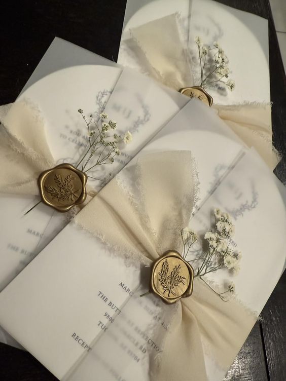 - Seal & Flowers: The ribbon is secured with a custom gold wax seal and a delicate sprig of dried flowers (baby’s breath).
