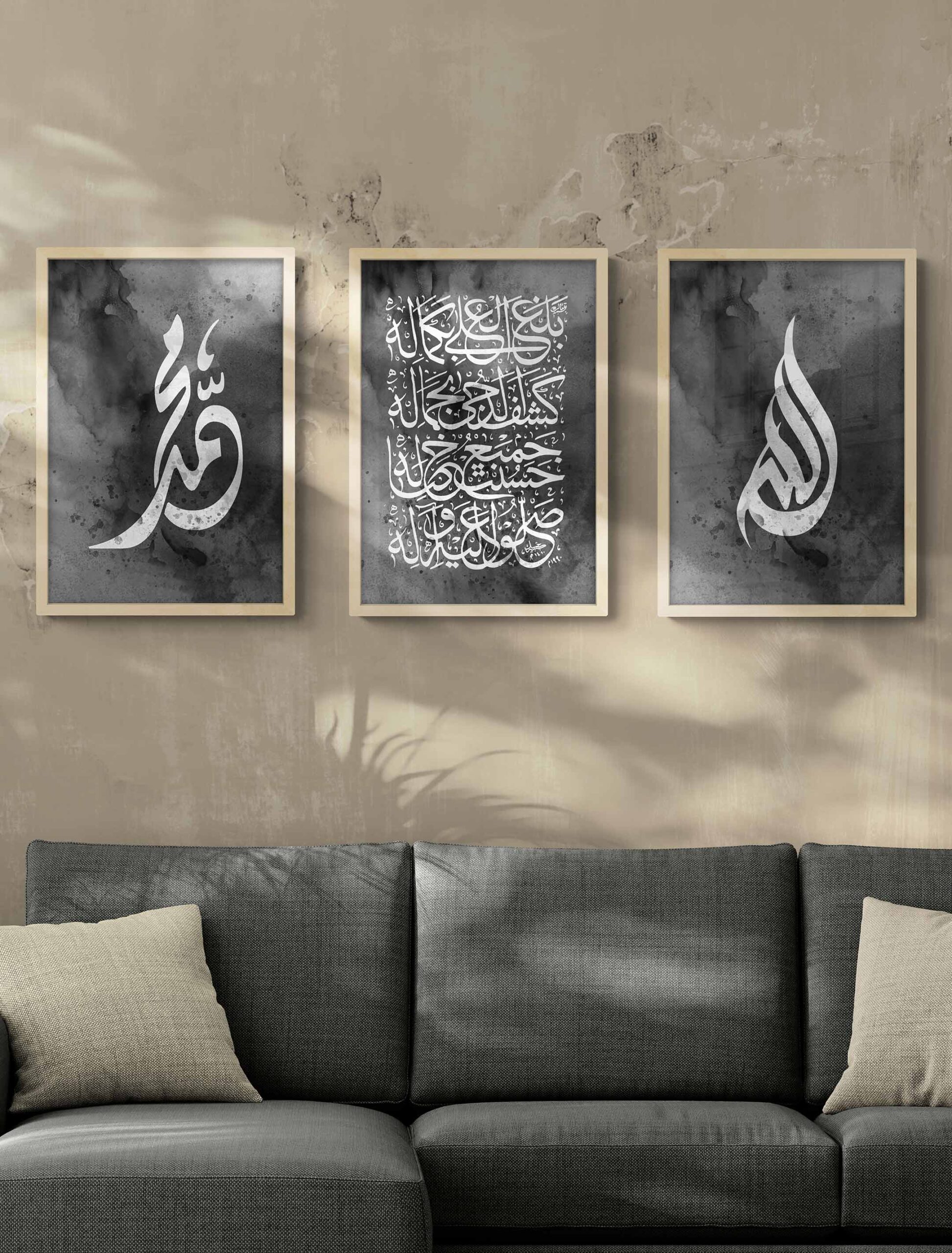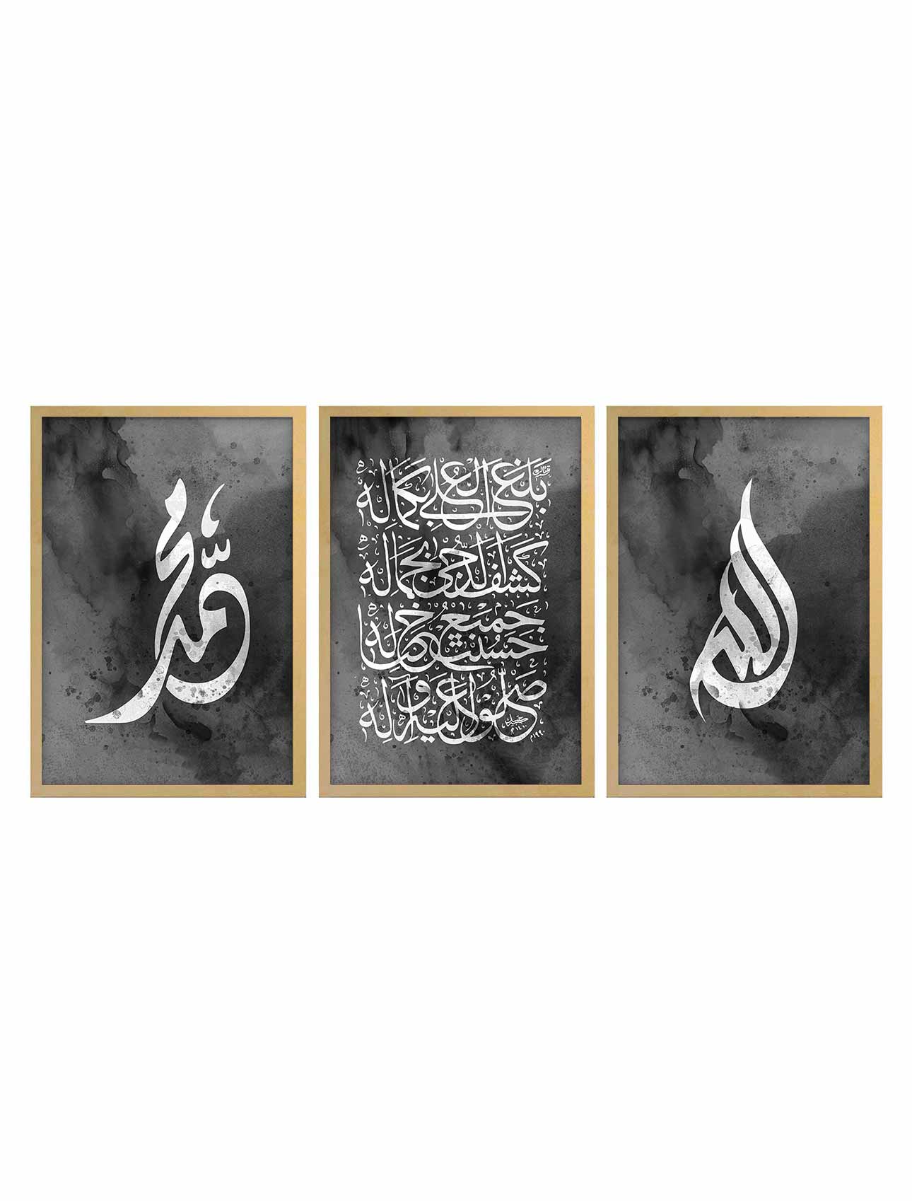 This black marble 3 Pcs Frame Set is a decorative item that features Allah, Muhammad, and Balaghal-Ula Bi-Kamaalihi Kalam written in beautiful Arabic calligraphy. Available in 19 x 13 inches, we carefully craft each frame from durable materials such as MDF, PVC, and Natural Wood. Moreover, the frame features a matte finish in three color tones (black, white, and wooden) that looks more satisfactory as shown in the pictures. However, you can select the frame material and color based on your preferences.