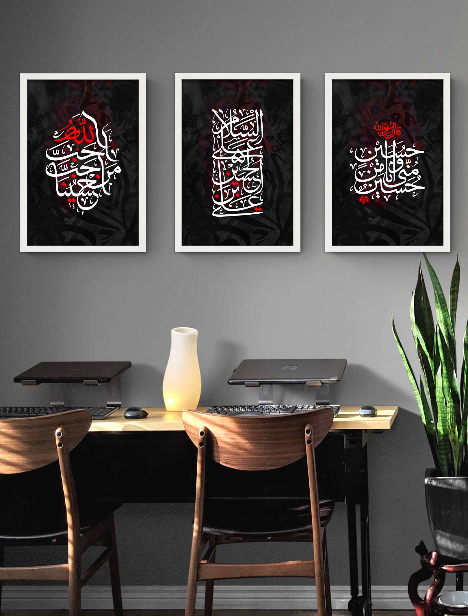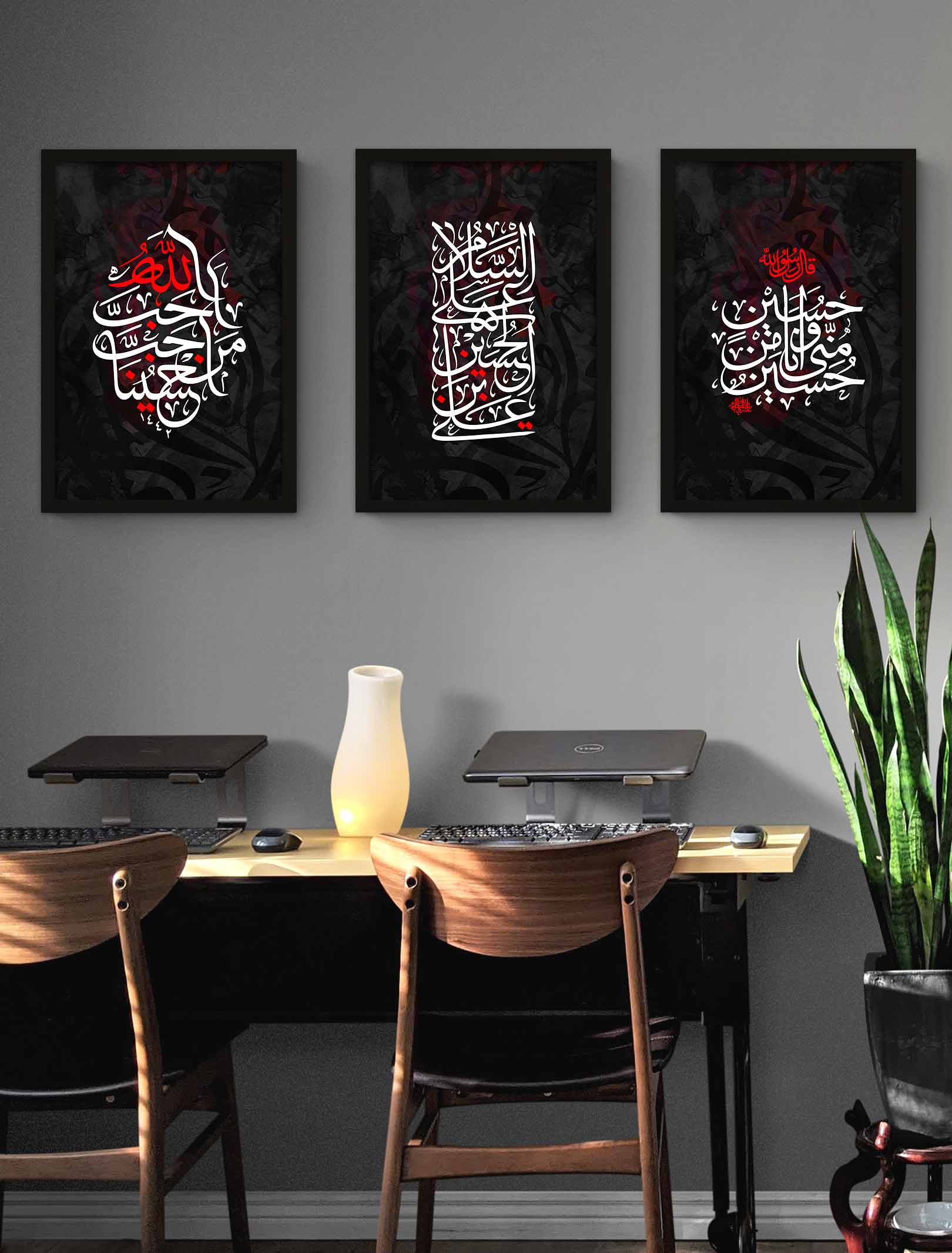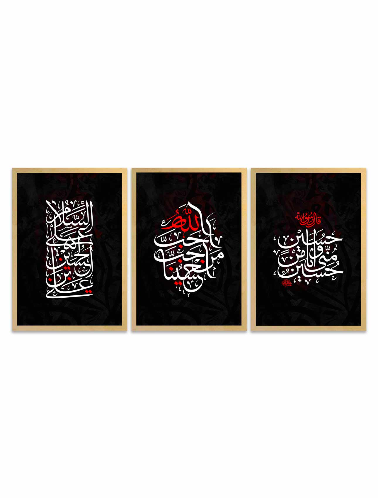 This Muharram special edition 3 Pcs Frame Set is a decorative item that features Hussain O Minni Wa Ana Minal Hussain, Salam Ala Hussain ibn Ali, and Ahaballah man Ahaba Hussaina written in beautiful Arabic calligraphy. Available in 19 x 13 inches, we carefully craft each frame from durable materials such as MDF, PVC, and Natural Wood. Moreover, the frame features a matte finish in three color tones (black, white, and wooden) that looks more satisfactory as shown in the pictures. However, you can select the frame material and color based on your preferences.