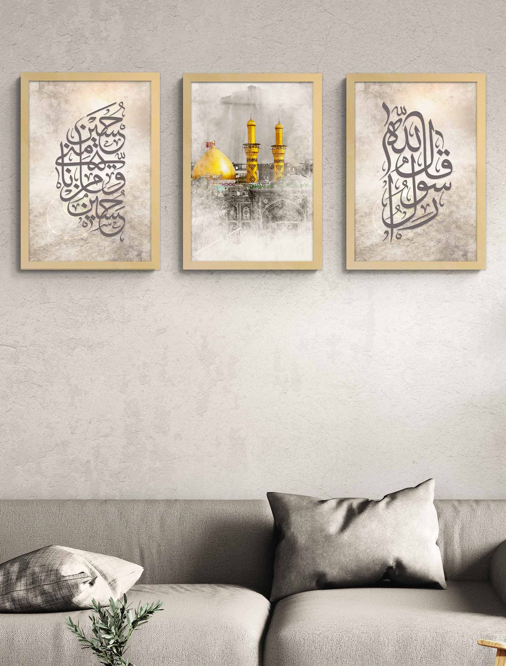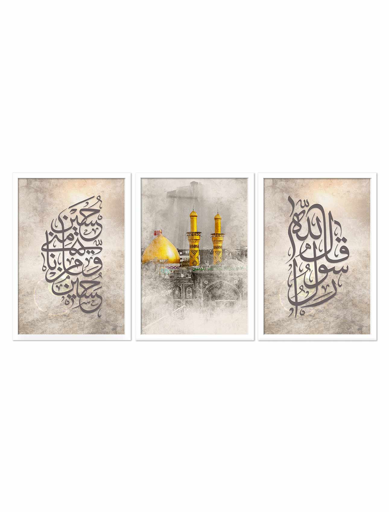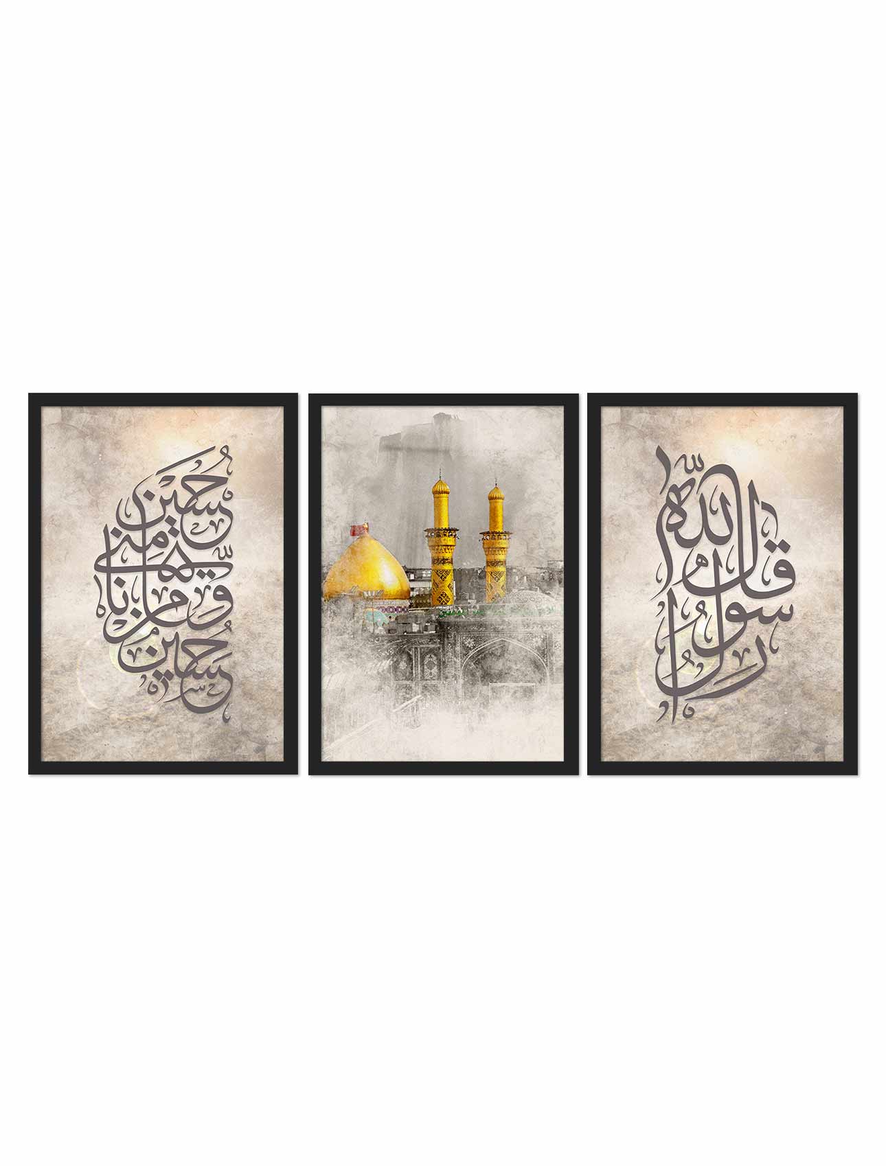 This 3 Pcs Frame Set inspired by the battle of Karbala is a decorative item that features Imam Hussain Shrine, Qala Rasool Allah S.A.W, Hussain O Minni Wa Ana Minal Hussain written in beautiful Arabic calligraphy. It translates to “The Prophet Muhammad S.A.W said: ‘Hussain is from me, and I am from Hussain.'” Available in 19 x 13 inches, we carefully craft each frame from durable materials such as MDF, PVC, and Natural Wood. Moreover, the frame features a matte finish in three color tones (black, white, and wooden) that looks more satisfactory as shown in the pictures. However, you can select the frame material and color based on your preferences.