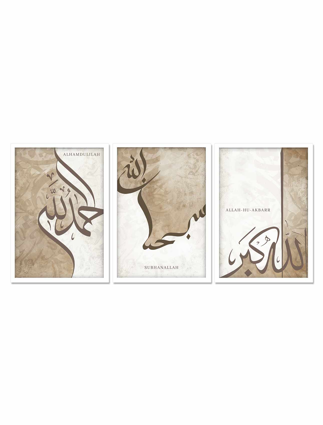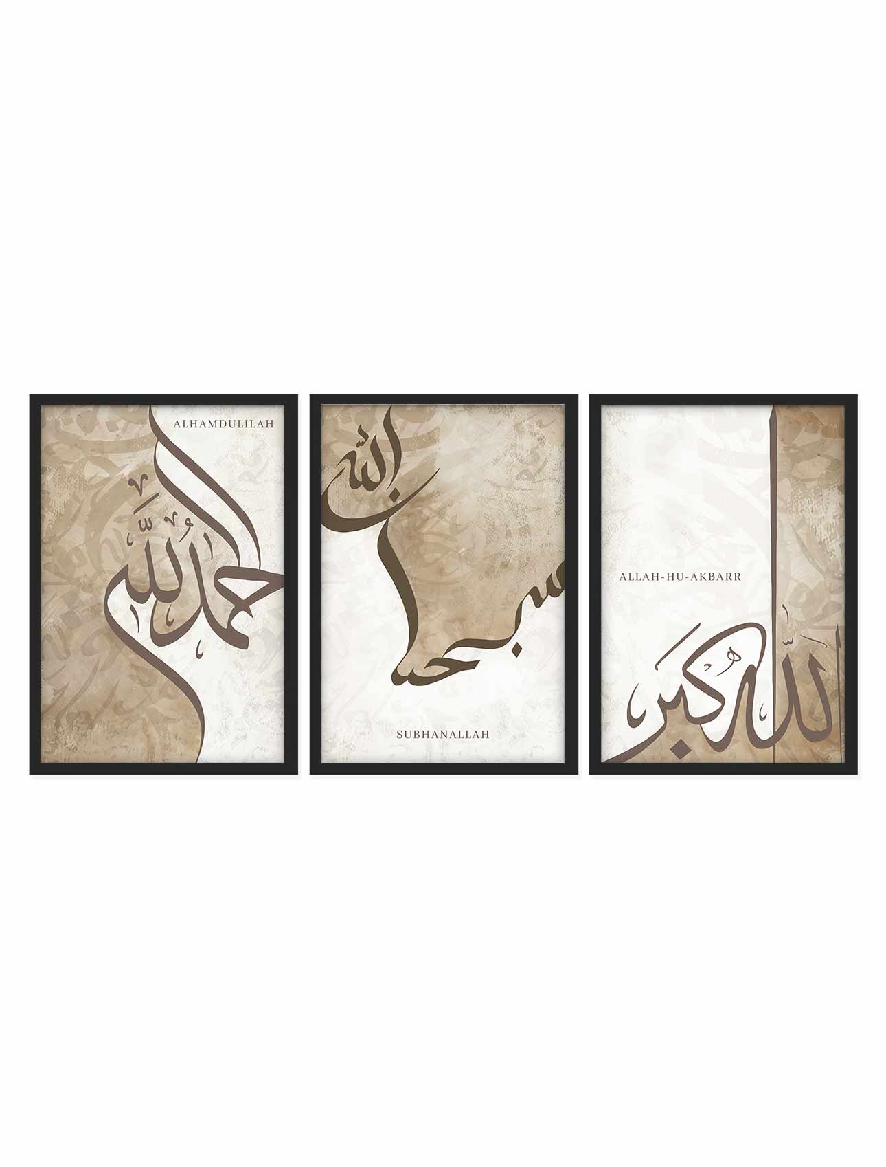 This brown and white with texture background 3 Pcs Frame Set is a decorative item that features Allahu Akbar, Subhan Allah, and Alhamdulillah written in beautiful Arabic calligraphy. Available in 19 x 13 inches, we carefully craft each frame from durable materials such as MDF, PVC, and Natural Wood. Moreover, the frame features a matte finish in three color tones (black, white, and wooden) that looks more satisfactory as shown in the pictures. However, you can select the frame material and color based on your preferences.